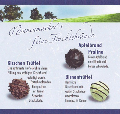 Heimischer Birnenbrand mit weißer Schokolade umschlossen. Ein muss für Kenner.
